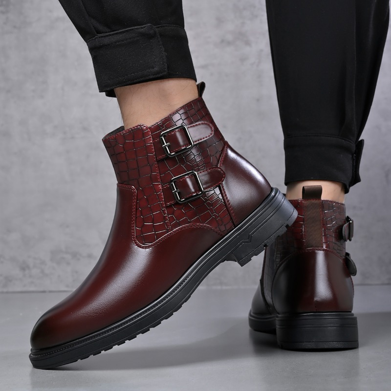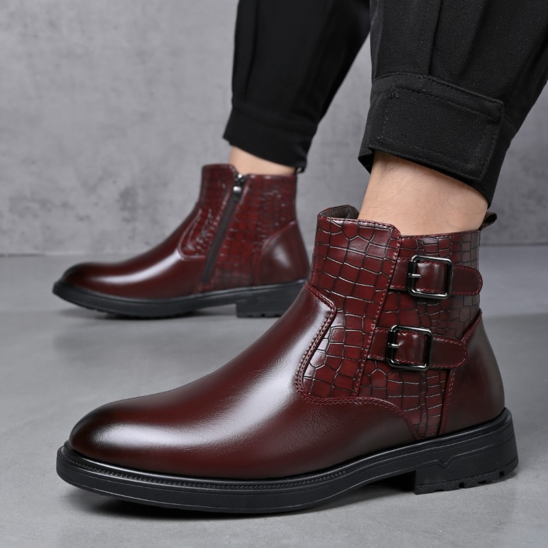 Men's Business Dress Ankle Boots, with a Convenient Side Zipper Design, Unique Crocodile Texture and Double Buckles, Non-Slip Thick-Soled Ankle Boots for Office, Weddings, and Parties, Professional Attire, Stylish Ankle Boots, Modern Menswear
