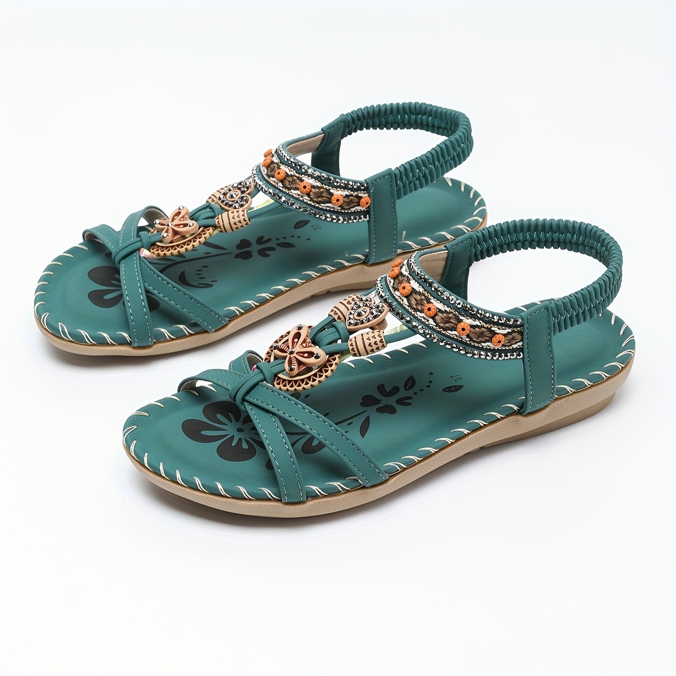 Summer Beach Sandals, Tribal Style Striped Flats for Women with Rhinestone Accents, Open Toe Slip-on, TPR Sole, Bohemian Casual Vintage Flat Heel Shoes