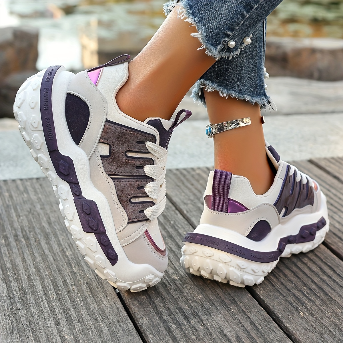 Women'S Chunky Gray & Purple Sneakers - Casual Lace-Up Sneakers with Thick Rubber Sole, Fashionable Low-Top Design, All-Season Wear