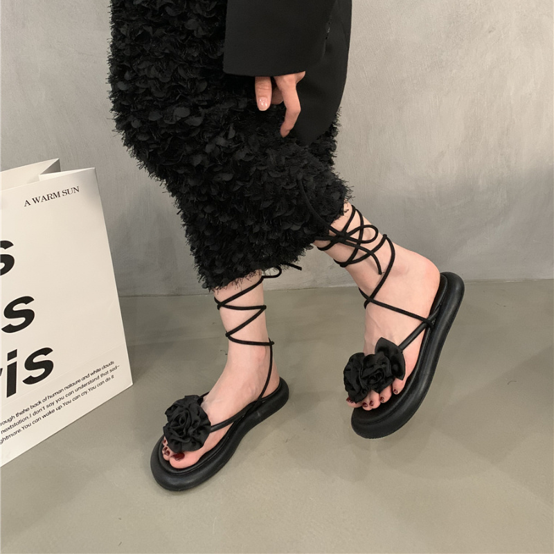 Women's Plus Size Roman Sandals - Black Synthetic Cover Adjustable Lace-Up Open-Toe Flat Sandals with Decorative Bow Accents, Comfortable Rubber Sole for Casual & Formal Occasions, Versatile Fashion Footwear | Crisscross Strap Design | Durable Footwear Construction, Strappy Sandals